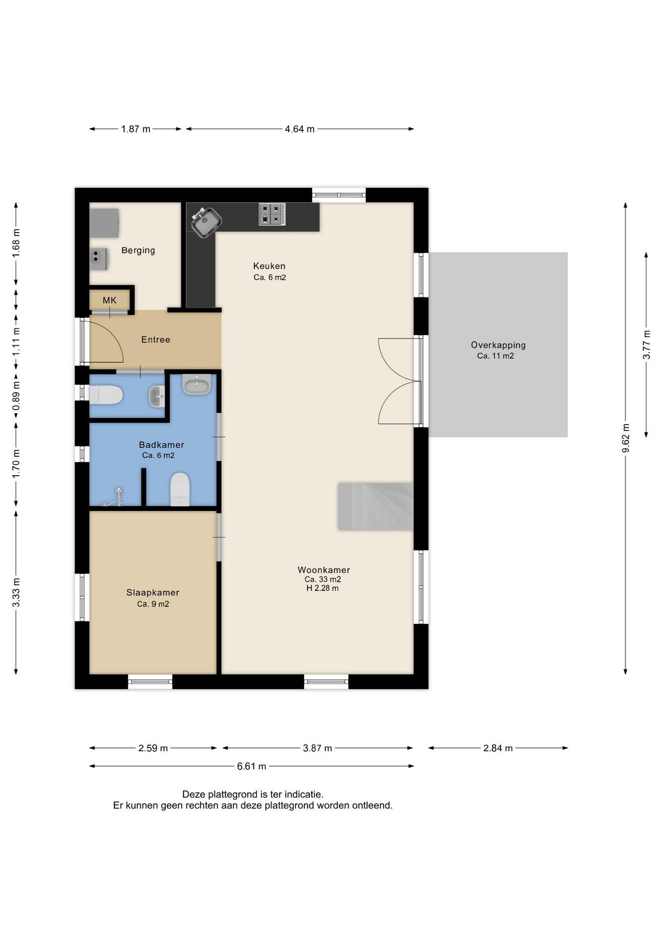 Entree in hal met meterkasten toilet biedt toegang tot de ruime woonkamer met open keuken (ca. 39m²). De keuken is voorzien van diverse inbouwapparatuur, waaronder een vaatwasser, oven, 4-pits gaskookplaat en afzuigkap. De woonkamer is sfeervol ingericht en heeft veel natuurlijk lichtinval. Vanuit de woonkamer zijn een slaapkamer(ca. 9m²) en de badkamer(ca. 6m²) toegankelijk. De badkamer is netjes afgewerkt en voorzien van een inloopdouche, toilet en wastafel in meubel. Tevens vanuit de hal is er een berging bereikbaar, hier is een wasmachineaansluiting en staat de CV opgesteld.